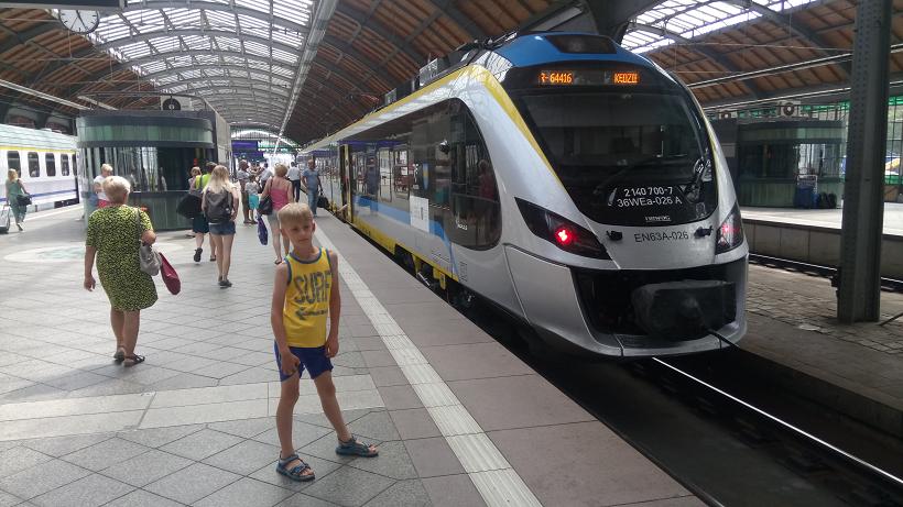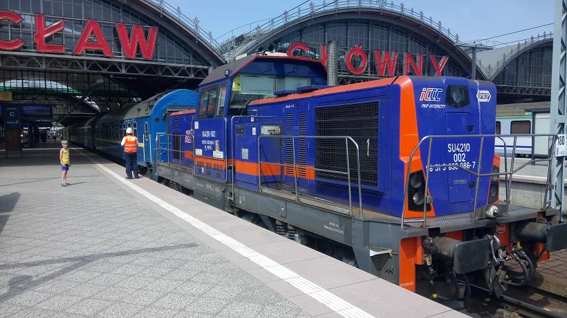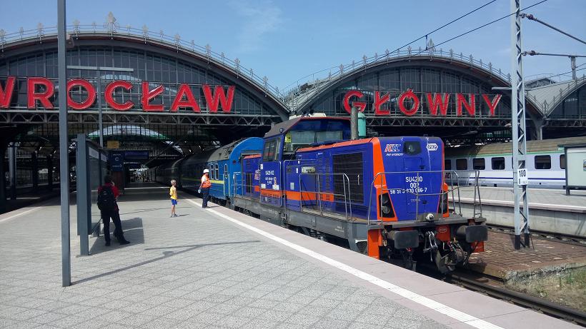 Wroclaw Main Station is in the city center and is a through station. The SU 42 shunter is about to hitch up and remove 3 coaches which will head back into Ukraine, Kiev.