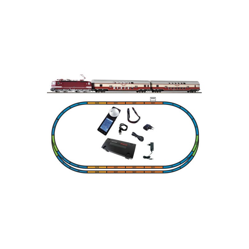 The PIKO SmartControl® system is the perfect choice for all model railway modellers who are looking for a contemporary and comfortable digital control. It is suitable for all gauges and track systems and combines the advantages of a smartphone controller with the special requirements of a model train control. This set includes a BR243 electric locomotive fitted with a PIKO sound decoder and a set of two double decker passenger coaches. The track in this set forms a large oval with an internal passing loop. A great set for any railway modeller. Contents: