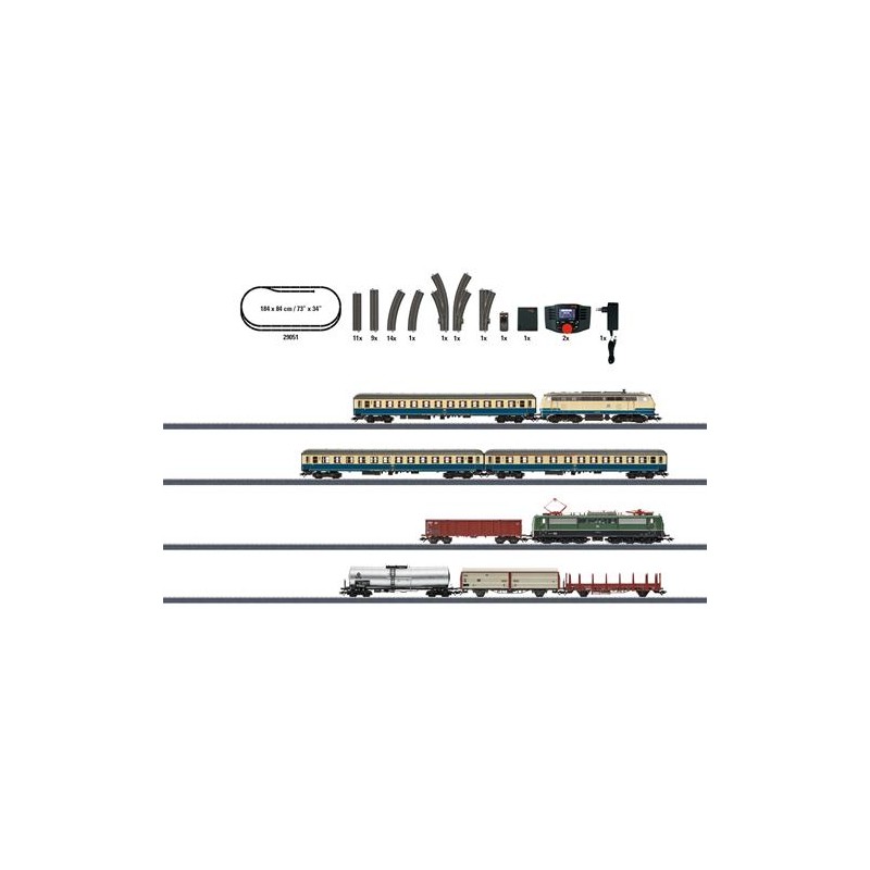 Electric locomotive BR 151, open goods wagon Eaos 106, stake wagon KBS 443, sliding wall wagon Hbis 297, mineral oil tank wagon, diesel locomotive BR 218, compartment wagon Bm 234 (2nd class), compartment wagon ABM 225 (1st / 2nd class), Compartment car Bm 234 of the German Federal Railways (DB). Locomotives with digital decoder mfx and extensive sound functions. Regulated high-performance drive. Traction tires. Depending on the direction of travel, the three-light peak signal operates conventionally, can be switched digitally. Illumination with maintenance-free, warm-white light-emitting diodes (LED). Coaches with gate-guided short couplings. Features: