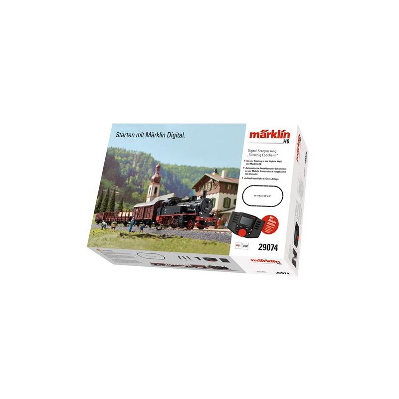 Prototype: Class 74 tender locomotive, open freight car Om 12, covered freight car Gr 20 and stake car Rlmms 56 of the German Federal Railways (DB). The most important data Item No. 29074 Track / type H0 / 1:87 epoch III kind Starter Sets Highlights Ideal entry into the digital world of Märklin H0. Automatic registration at the Mobile Station via built-in mfx decoder. Body-friendly C track system. Locomotive with play fun increasing Relexkupplung. product Model: locomotive with digital decoder mfx and special motor with flywheel. 3 axles driven. Traction tires. Depending on the direction of travel, the three-light peak signal operates conventionally, can be switched digitally. Trolley with slide guide and Relex couplings. Length of the train 51 cm. Contents: 12 curved tracks 24130, 4 straight tracks 24188, 4 straight tracks 24172. Rail junction box, 36VA / 230 V switching power supply and mobile station. Illustrated play book with many tips and suggestions. Expansion options with the C-track expansion packs and with the entire C-Track program. characteristics /Chassis of the locomotive made of metal.eDigital decoder with up to 32 digitally switchable functions. The respective number depends on the used control unit. DCC decoder H Three-way peak signal alternating with the direction of travel. epoch 3 |