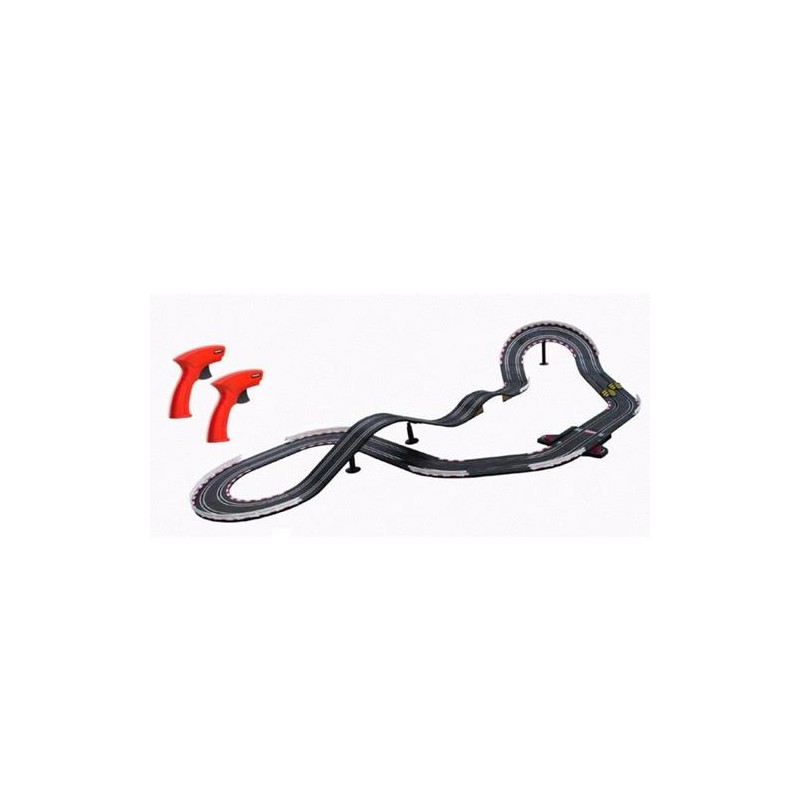 New set with lots of interesting features such as high banked curves, high hump bridges and jump stunts. It also includes two cars in 1:43 scale and mechanical lap counter to make exciting races. The controllers in this set are set up to provide smooth operation with proportional trigger with up to 5 speed settings. A great set for a one on one race. Measurements: